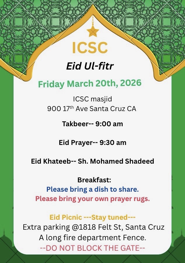 - Please DO NOT over park at the main parking lot of the masjid as some people may need to leave early and you do not want to block them.